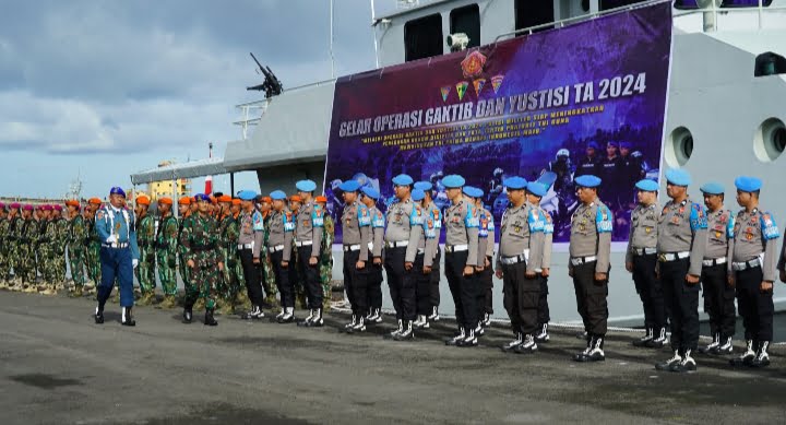 Upacara Gelar Operasi Penegakan Ketertiban (Gaktib) dan Operasi Yustisi Polisi Militer (POM) TNI TA 2024 bertempat di Dermaga Layang, Mako Lantamal VI Makassar, Jl. Yos Sudarso, Kota Makassar. Jumat, 8/3/2024.
