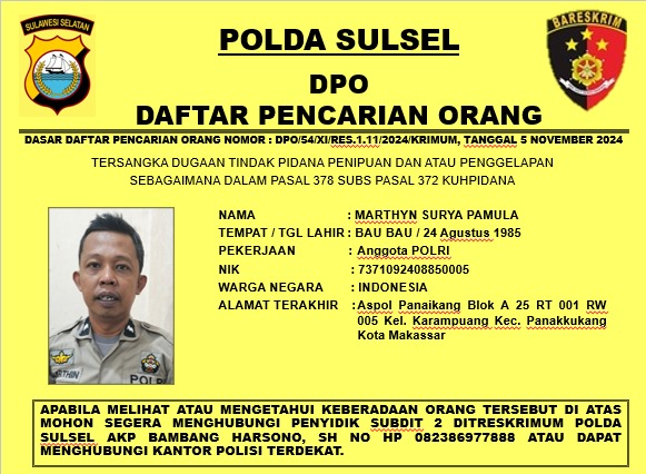 MAKASSAR – pantau24jam.net. Kasus memalukan kembali mencoreng institusi Polri. Aipda Marthyn Surya Pamula, anggota Polrestabes Makassar, bersama istrinya, Bahrani, kini berstatus sebagai buronan usai ditetapkan sebagai tersangka kasus penipuan dan penggelapan.