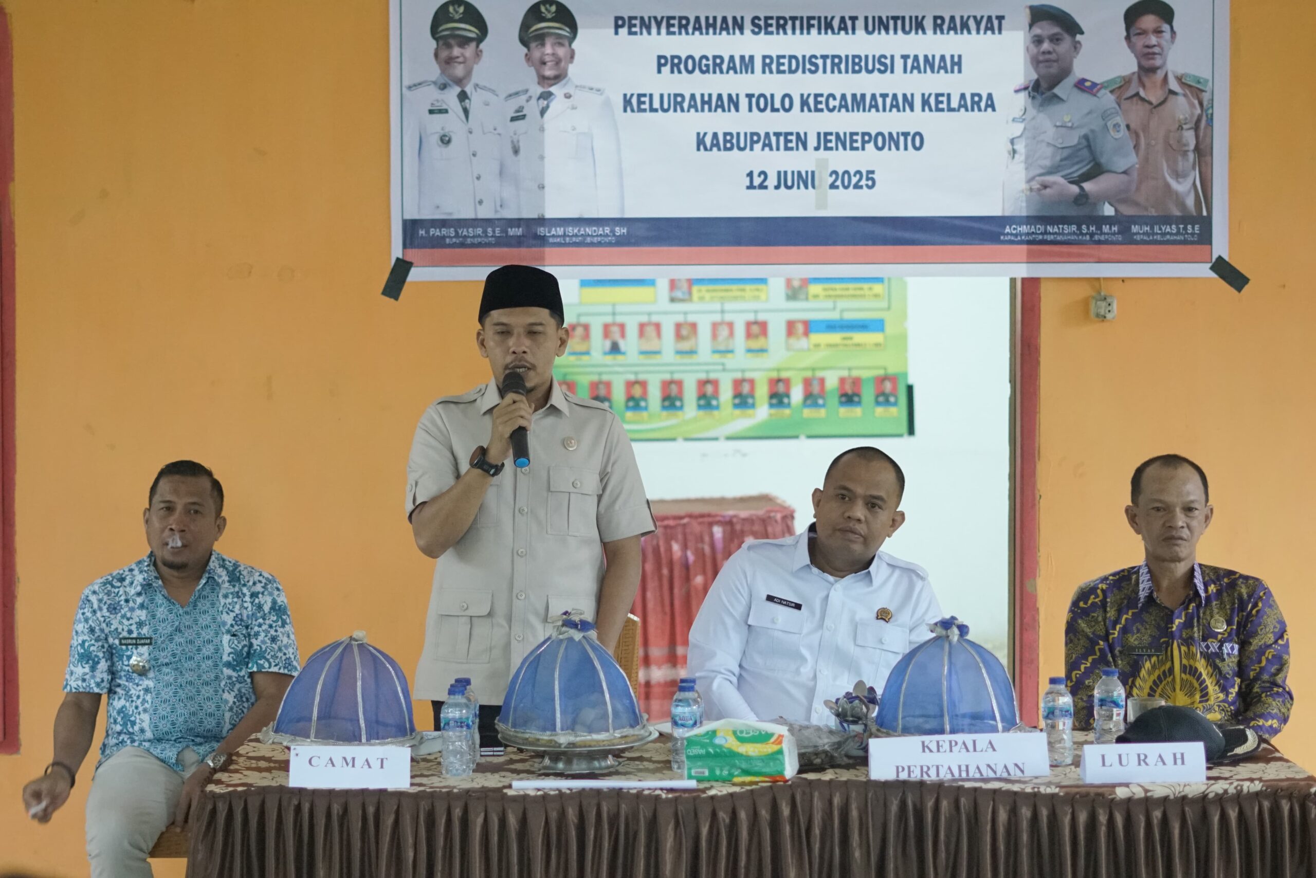 Hal ini diwujudkan melalui kegiatan penyerahan sertipikat redistribusi tanah kepada masyarakat Kelurahan Tolo, Kecamatan Kelara. Kamis, 12/6/2025m