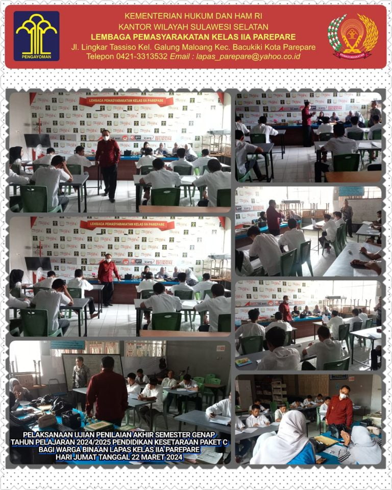 PAREPARE – pantau24jam.net. Ujian Penilaian Akhir Semester Genap Tahun Pelajaran 2024/2025 Pendidikan Kesetaraan Paket C (setara SLTA) yang diikuti sebanyak 18 (Delapan Belas) orang warga binaan permasyarakatan (WBP) bertempat di Lapas Kelas IIA Parepare mulai pukul 09.00 Wita sampai dengan selesai telah sukses dilaksanakan.